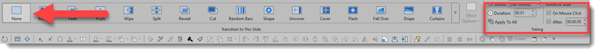 First, set your slide transition (and each slide transition in the animation sequence) to auto advance by clicking the AFTER checkbox and set the timing at 00:00 (e.g., no pause between slides advancing).