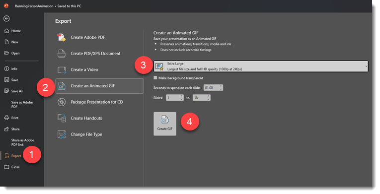 After setting our presentation to loop, we previewed the animation in slide show mode, to confirm it looped seamlessly. We are now ready to export our animation as a GIF, making sure to select “Extra Large” so it will export at the 1080×1080 pixel size: