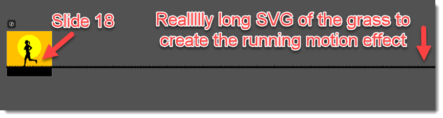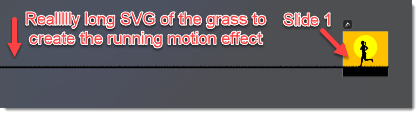 A graphic of grass was then added, duplicating the graphic and aligning it end-to-end, making sure the art was long enough to create a seamless loop for the final animation. Specifically, the edge of the grass graphic was lined up to the right edge of our first slide (the first frame). Then, skipping to the last frame, the grass graphic was moved all the way to the left, so the edge was lined up with the left side.