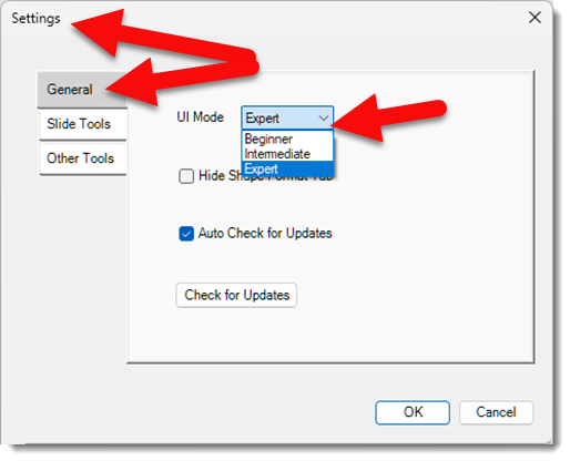 What reminded me of this past conversation was the ToolsToo PowerPoint add-in. ToolsToo has 3 different toolbar preset layouts. In the Settings for ToolsToo, on the General tab, is the UI Mode setting. When ToolsToo is first installed, one of the dialog options sets the UI Mode for that computer’s ToolsToo interface. Note: this setting can be changed at any time.