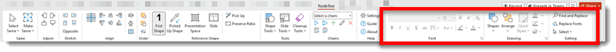 I use so many of the ToolsToo functions daily – often hourly! So, needless to say, this is an honest review from someone who truly leverages the tool. Let’s shift a bit and focus on what ToolsToo features I use often and can’t function as a presentation designer without. To start, ToolsToo is a very full ribbon, complete with dozens of additional tools hidden in the many dropdown menu options.