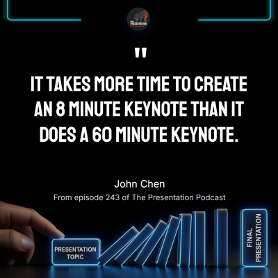 In episode 243 of The Presentation Podcast, Troy Chollar of TLC Creative Services, has a conversation with certified speaking professional John Chen. They discuss the immense amount of unseen effort behind every presentation. The conversation focuses on John’s eight-minute keynote at a Canadian Association of Professional Speakers event, and the 100+ hours of preparation, collaboration with coaches, technical stagecraft, that preceded the actual presentation delivery.