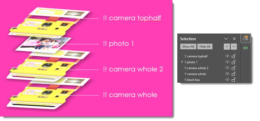 However, this part of the animation was problematic at first – our camera was popping on top of our photo for a brief moment during the morph animation, which clearly looked wrong. With a few extra layers and proper labeling in the selection pane, we essentially added a duplicate camera image underneath the photo and animated it to appear as the other camera layer disappeared.