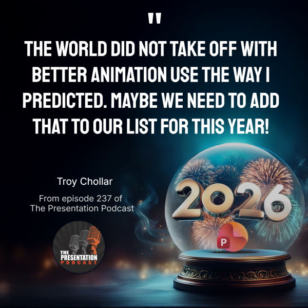 This marks a milestone for The Presentation Podcast – over a decade of expert commentary on the ever-evolving world of presentation design! Hosts Troy Chollar, Sandra Johnson, and Nolan Haims kick off 2026 with a review of their 2025 presentation predictions. They then unveil their presentation and PowerPoint forecasts for 2026. Listen on your favorite podcast app, or at The Presentation Podcast site HERE