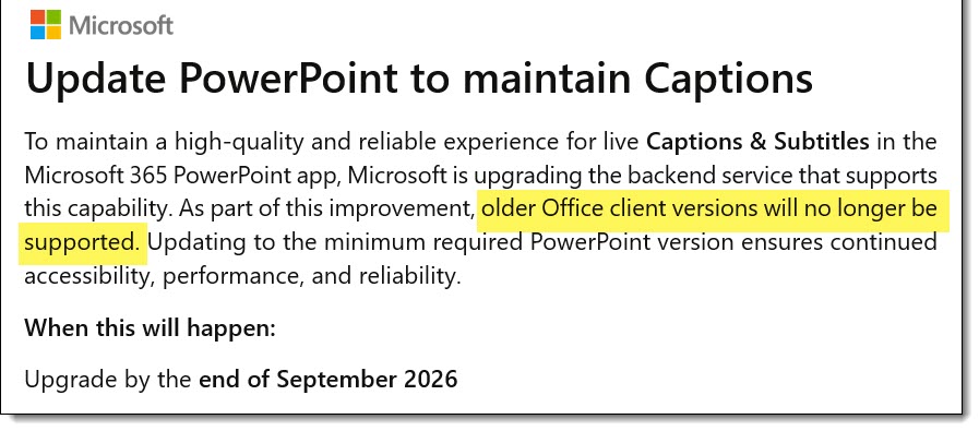 I can admire, and not admire, the long standing Microsoft position of wanting to assure legacy software versions of PowerPoint, Word, Excel, etc. always work with files from newer versions of the app. BUT, as the saying goes, “change is in the wind”. For the first time I have seen, the Microsoft Suite is officially moving forward – and not bringing along legacy versions of its software (and by legacy, we could be talking about support for PowerPoint 2000!).