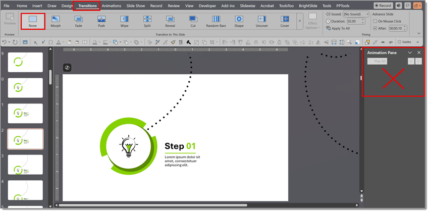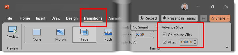 First, set your slide transition (and each slide transition in the animation sequence) to auto advance by clicking the AFTER checkbox and set the timing at 00:00 (e.g., no pause between slides advancing).