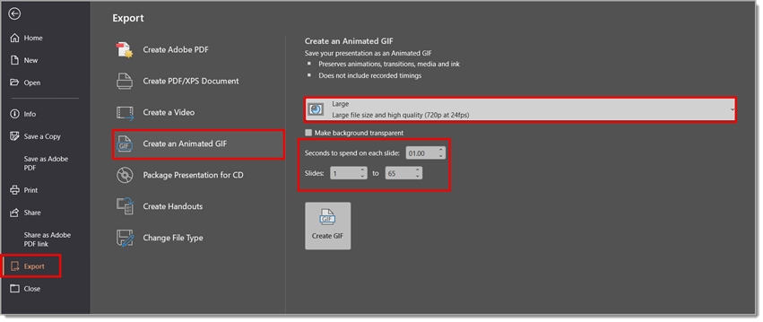 TIP: GIF is a large file size format. PowerPoint has four resolution/quality GIF output options. We generally use 720p for social media for a balance of file size and quality. For using an animated GIF in a presentation where file size may not be the same concern, we will often export to the full 1080p if the GIF will be a full slide element.