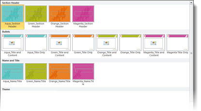 This is from a recent project that was all one template, but with 4 distinct color options. The client requested a simple structure, specifically not 4 duplicate sets of master slides. So we organized the Master Slides into 3 categories: