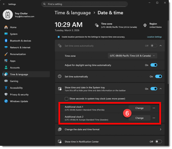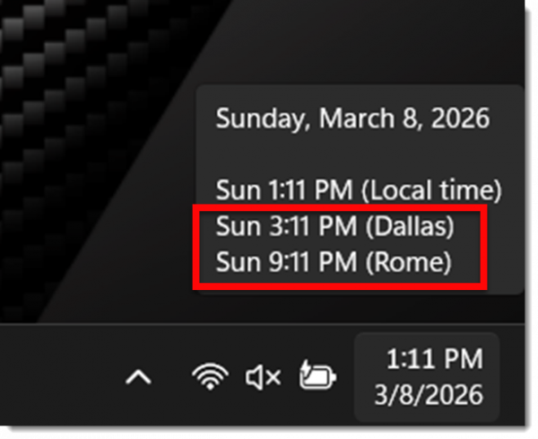 Windows has the ability to add 2 additional clocks time zones to the task bar. But Windows 11 has changed how to set/update the additional clocks (side note: I hope you find this blog post helpful – but really, it is for me to have a reference of where to find these settings when I need to update my computer as I generally update one or both of the additional clocks weekly 😊).